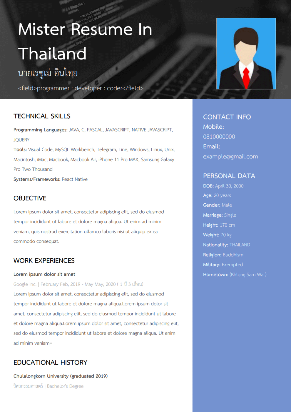 นอกจากนี้เรายังได้ใส่รูปประกอบลงไปที่หัวกระดาษของเรซูเม่ เพื่อเพิ่มความสวยงาม และดูเป็นมืออาชีพ และในขณะเดียวกันก็ไม่มีสีสันฉูดฉาด หรือคอนทราส์ที่จัดเกินจนดึงความสนใจไปจากข้อมูลที่จะนำเสนอในตัวเรซูเม่ ต้องบอกว่าสองธีมนี้ลงตัวจริงๆ ครับ พวกเราเองนั่งทำกันยังถูกใจกันเลยครับ